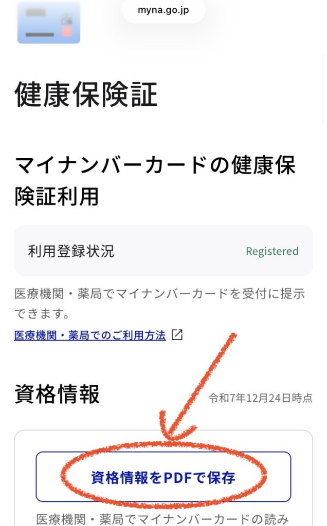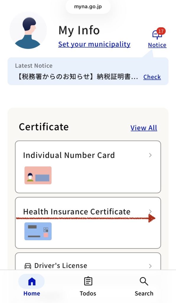 Health Insurance Certificateをタップします。 - 現在加入している健康保険の情報が表示されます。